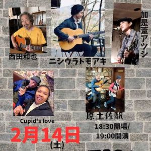バレンタインの日なので 愛の歌縛り、ってこともないです。 ジプシージャズの名手ニシウラさん 備後の歌男西田さん 広島で弾け続ける加是葦くん 喋り名人原さん ジャマイカからの歌姫シャンナ でお送りする歌と音楽の夜です。 お […] ...