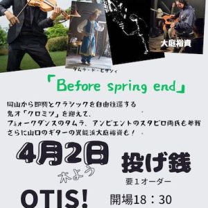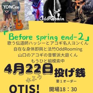 4月22日水曜日 投げ銭 Before spring end-2 歌う伝道師ハッシーと アンビエントなアコギ奏者 やまざきようへい君のデュオ YONCee 法竹と舞踏の異能派デュオ OddRoomin アコースティックギ […] ...