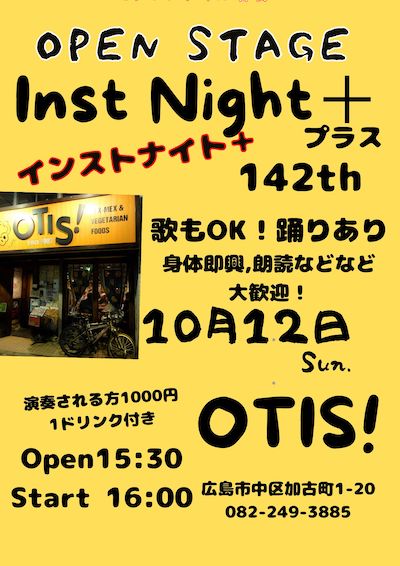 検索検索Recent PostsTonight,sept.15th. due to staff shortage, we’re open only for live music: a Gypsy Jazz guitar duo. Doors 6:30 PM, donation basis.Sorry no food. TODAY.Aug 30th. We are temporarily closed.We apologize for the inconvenience, TODAY,On August 28, open 2:00–4:00 pm, reopen 7:00 pm for Argentine Tango live at 7:30 pm. Menu as usual. Admission ¥3,000. 本日は2時から4時オープン、夜のライブのリハのため一旦閉めます、ライブは19時開場、素晴らしいアルゼンチンタンゴです、料金3600円。お食事メニューは普段通りです。よろしくお願いいたします。 Aug.25.Today only, due to a sudden refrigerator issue, we will open at 4:00 PM. Recent Comments表示できるコメントはありません。Archives2025年9月2025年8月2025年7月2025年6月2025年5月2025年4月2025年3月Categories Uncategorized 日付 10 / 12 (日) 時刻 4:00 pm オープンマイク、インストナイト+142th OTISのオープンマイクの夜 インストナイト+(歌もオッケーです) オープンマイクはある程度の制約ありますが ジャンル、部門レベルを問わず みなさま参加出来ます。 各種楽器演奏をはじめ(エスニックなもの歓迎💦) 歌、踊り、お話、、色々歓迎です。 3時半から受付開始。 何かされる方、参加費1000円1ドリンク付き 見学のみも可です。 このイベントをシェアする
