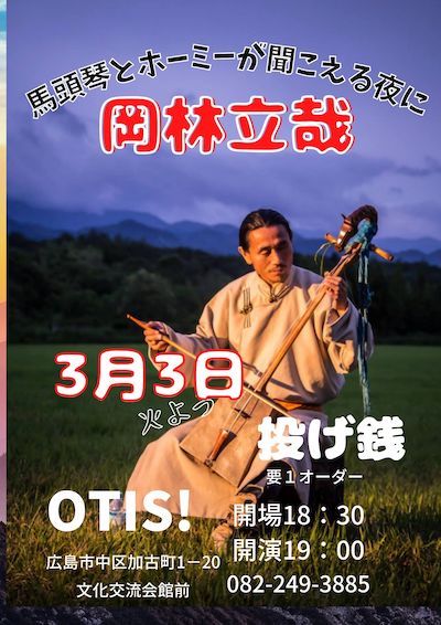 検索検索Recent PostsToday Dec18.Open 12:00–3:00, closed temporarily, Live show starts at 6:30 PM. Food menu as usual.covercharge¥4100 Today Dec17.Open 12:00–3:00, closed temporarily, Live show starts at 6:30 PM. Food menu as usual.covers chargecovers charges3000yen. Today (Tue, Dec.16): Open 12:00–14:00 & 17:00–21:00. Closed 15:00–17:00. Due to a change in kitchen staff, our opening days and hours may vary for a while. Please check here for updates. Today (Dec. 14): Open mic from 4:00 PM. Free live music. Sorry no food. Recent Comments表示できるコメントはありません。Archives2025年12月2025年11月2025年10月2025年9月2025年8月2025年7月2025年6月2025年5月2025年4月2025年3月Categories Uncategorized 日付 3 / 3 (火) 時刻 7:00 pm 岡林立哉 岡林立哉! 心境著しいとはこの人のこと? 進化が止まらない感じの時期に入られたかと。 広ーい草原を渡る風のように遠く響く 馬頭琴のおと、ホーミーのひびき 素晴らしい層を織りなす音楽を聞かせてくださいます。 このイベントをシェアする