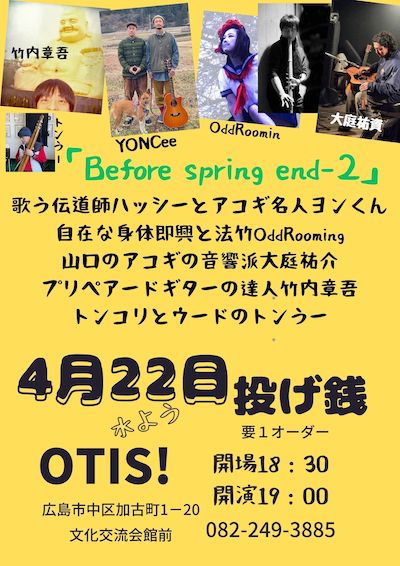 検索検索Recent PostsToday, Saturday, March 14:We will temporarily close at 3:00 PM for live rehearsal and reopen at 5:00 PM.Live charge: 4,000 JPY. Please note that we will temporarily close at 4:00 PM on those days to prepare for the performances.On live days. We have live shows on Mon, Tues, Fri, and Sat this week. Today, February 25th.We are temporarily closed, due to staff circumstances. We apologize for the inconvenience. Due to a shortage of kitchen staff, we will open 4:00 PM. Recent Comments表示できるコメントはありません。Archives2026年3月2026年2月2025年12月2025年11月2025年10月2025年9月2025年8月2025年7月2025年6月2025年5月2025年4月2025年3月Categories Uncategorized 日付 4 / 22 (水) 時刻 7:00 pm Before spring ends2 タイ遠征も成功させた 広島のレゲエユニット「ビッグマー」で 大活躍中のハッシーと 湯来のアコギ名人山崎ようへいのデュオ 「ヨンシー」 広島のプリペアードギター名人「竹内章吾」 法竹と舞踏のユニット 「Odd Rooming」 山口の鬼才「大庭ゆうすけ」 トンコリとウードでオリジナルやトラッドを歌う「トンうー」 投げ銭です。 よろしくお願いします。 このイベントをシェアする